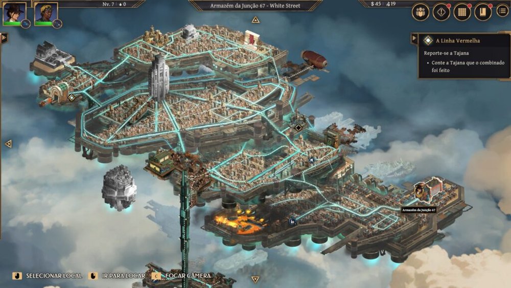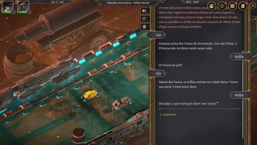 Neste tabuleiro de desigualdade extrema, assumimos o controle de Gia. Ela carrega a essência do contrabandista desgastado pela vida, alguém que já perdeu muito mais do que gostaria de admitir em um trabalho que deu errado no passado. Gia apresenta-se como uma protagonista cínica, cuja armadura emocional é forjada em sarcasmo e uísque de segunda categoria. Sua jornada começa de maneira trivial, com uma tarefa de transporte que rapidamente escala para uma conspiração política capaz de fragmentar as bases daquela sociedade voadora. Ao seu lado, encontramos Nellie, uma cientista acadêmica protegida pela bolha da elite, cuja ingenuidade serve como o contraponto -e orelha do jogador para esse mundo- perfeito à aspereza de Gia. A dinâmica entre as duas, somada à presença de Cress, uma mecânica resiliente que personifica a força da classe trabalhadora, forma o núcleo emocional que sustenta as quase quinze horas de campanha.