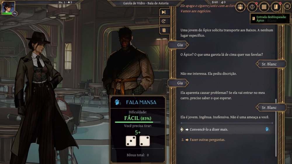 O sistema de jogo repousa sobre a fundação de RPGs clássicos, utilizando rolagens de dados para determinar o destino das interações sociais. Cada conversa representa um campo de batalha potencial, onde investir em atributos como Charme, Intimidação ou Intelecto define as rotas disponíveis. O brilho desse sistema reside na aceitação do erro. Em Aether & Iron, o fracasso em uma rolagem de dados constitui um evento narrativo tão rico quanto a vitória. Uma mentira mal contada ou uma tentativa de suborno que termina em detenção servem apenas para desviar a história por caminhos inesperados, reforçando a sensação de que o mundo reage às imperfeições do jogador. Existe uma filosofia clara de que o destino é algo que se molda tanto pelos acertos quanto pelas cicatrizes de erros.