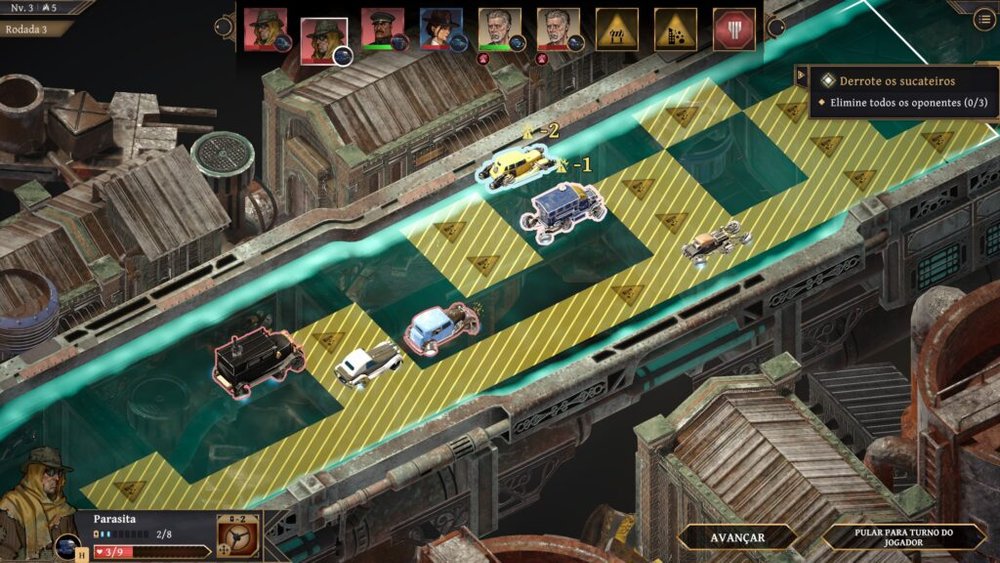 No aspecto técnico, a execução de Aether & Iron demonstra um polimento notável para um projeto de seu porte, apresentando um desempenho estável mesmo em sessões prolongadas. A interface de usuário, embora estilizada com elementos industriais pesados, mantém a clareza necessária para a navegação rápida entre menus de customização e mapas. Pequenos bugs de colisão nas batalhas de carros ocorrem ocasionalmente, e problemas de carregamento inicial de um save mais longo também trouxeram algumas dores de cabeça, mas a frequência desses episódios permanece baixa o suficiente para evitar a frustração. Pude testar o suporte completo a controles modernos que também garante uma experiência fluida, independentemente da forma escolhida para o gameplay.