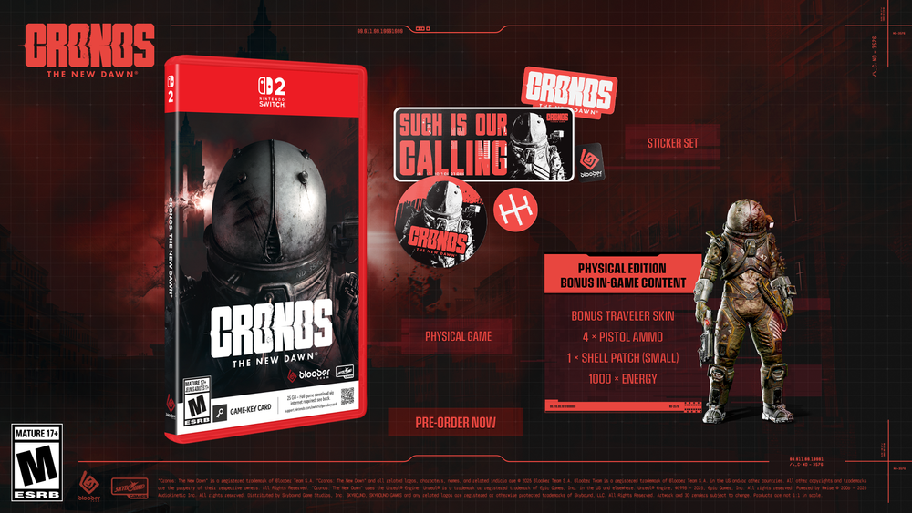 Além da versão digital já confirmada, a Bloober Team anuncia uma edição física exclusiva de Cronos: The New Dawn para o Nintendo Switch 2, fruto da parceria com a distribuidora Skybound Games. O pacote inclui um cartão-chave para a versão padrão do jogo, uma skin única para a protagonista Viajante, além de adesivos colecionáveis e um arsenal digital valioso para os jogadores.
