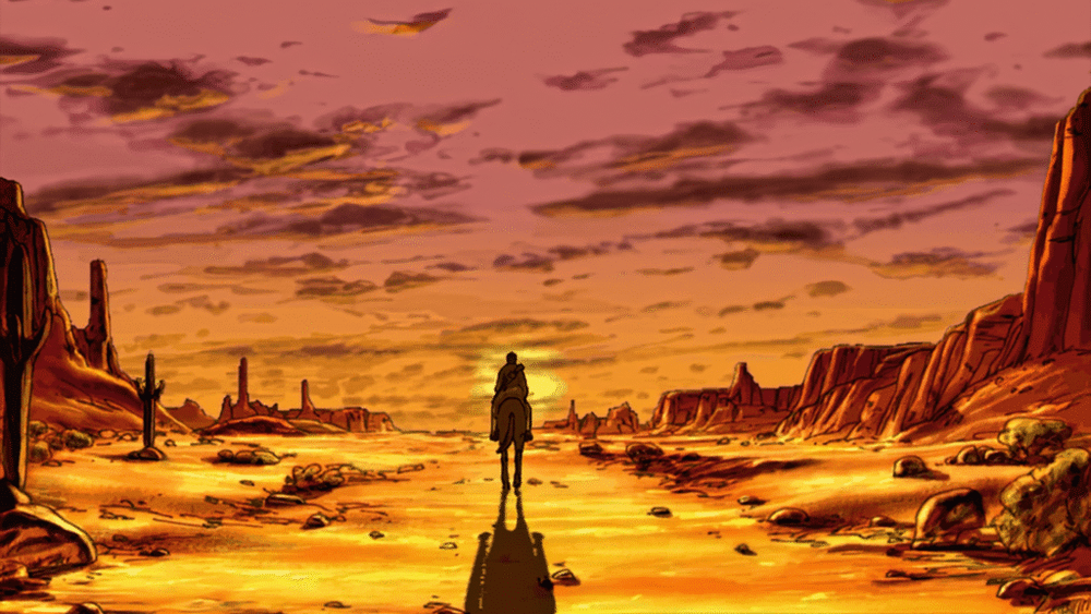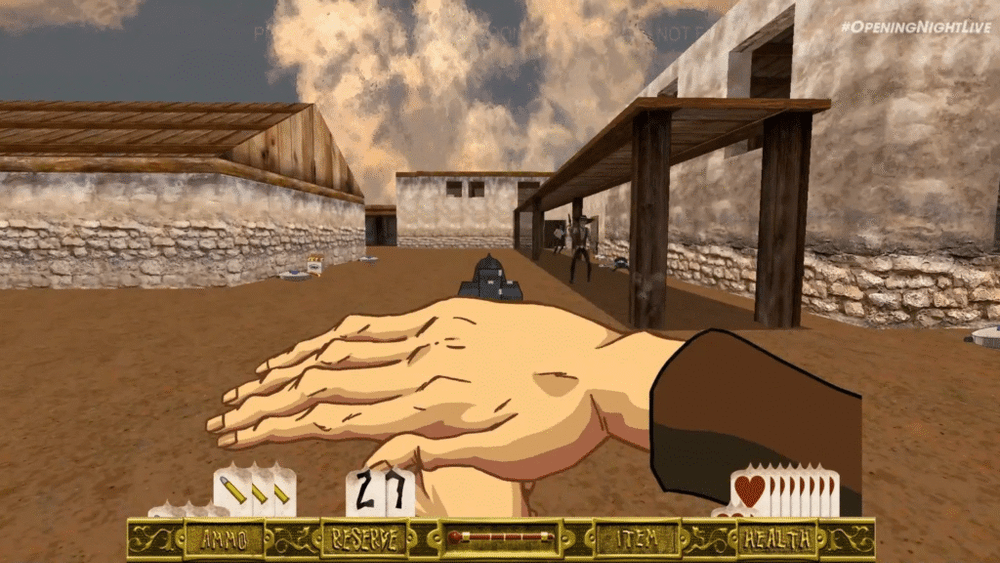 A primeira coisa que salta aos olhos é a direção de arte, sobretudo o trabalho com as cinemáticas entre fases. Aqui, Nightdive conseguiu fazer algo genuinamente especial: as animações de abertura de cada missão são obras de arte visual que remetem a clássicos de animação ocidental, com paleta quente, traços decisivos e composição cinematográfica que ampliam a narrativa de forma efetiva. As cinemáticas são desenhos animados em estilo que remete à tradição de westerns clássicos — próximas aos trabalhos de Ennio Morricone em tom visual —, trazendo dramaticidade e presença para uma história que, de outra forma, seria puro pretexto para ação. É nesse departamento que o jogo brilha genuinamente, oferecendo uma experiência visual que transcende as limitações técnicas de sua base original. A trilha sonora, por sua vez, segue na mesma linha orquestral e envolvente, criando aquele clima cinematográfico que diferencia Outlaws de outros FPS de sua era.